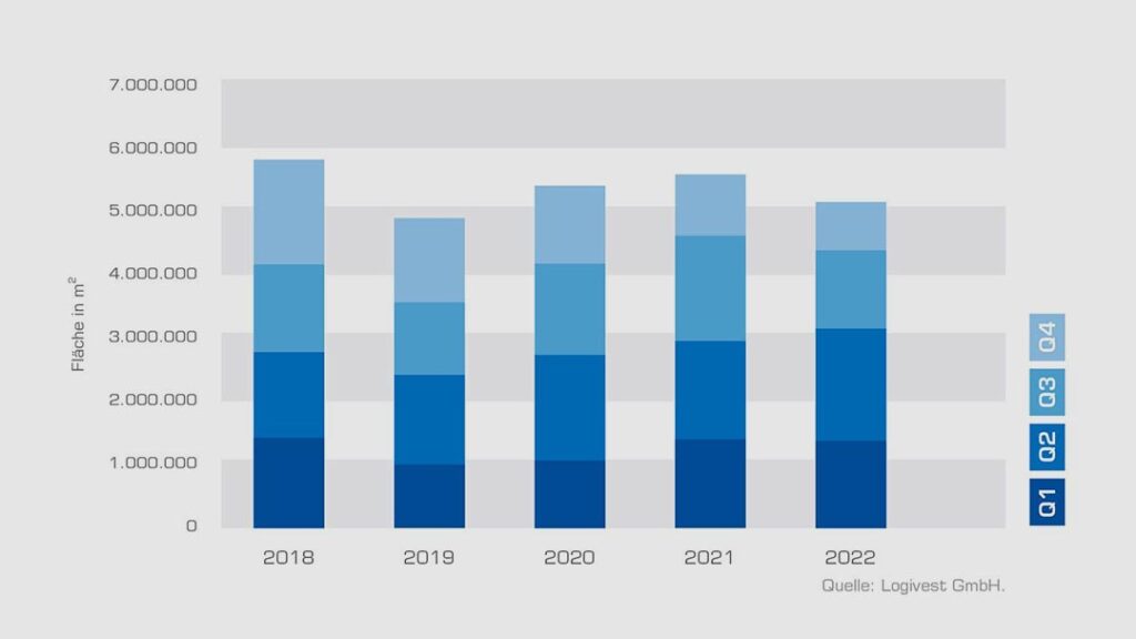 Mit einem leichten Rückgang hat laut Logivest der Logistikimmobilienmarkt das Jahr 2022 in puncto Neubauvolumen abgeschlossen. Mit insgesamt rund 5,1 Millionen Quadratmetern Logistikneubaufläche waren es rund 400.000 Quadratmeter weniger als 2021.